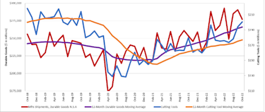 The graph below includes the 12-month moving average for the durable goods shipments and cutting tool orders. These values are calculated by taking the average of the most recent 12 months and plotting them over time.