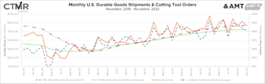 The graph below includes the 12-month moving average for the durable goods shipments and cutting tool orders. These values are calculated by taking the average of the most recent 12 months and plotting them over time.