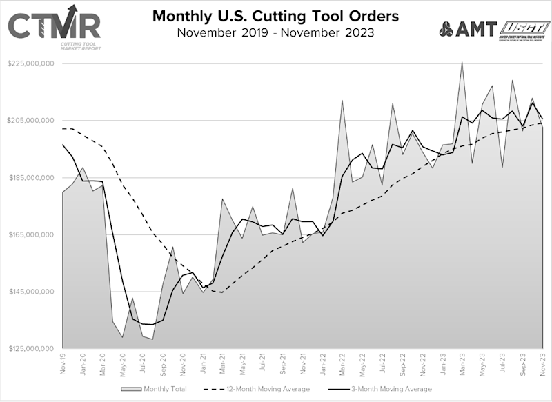 McLean, Va. (January 18, 2024) — November 2023 U.S. cutting tool consumption totaled $202.7 million, according to the U.S. Cutting Tool Institute (USCTI) and AMT – The Association For Manufacturing Technology. This total, as reported by companies participating in the Cutting Tool Market Report collaboration, was down 4.9% from October’s $213 million and up 4.4% when compared with the $194.1 million reported for November 2022. With a year-to-date total of $2.26 billion, 2023 is up 7.5% when compared to the same time period in 2022.