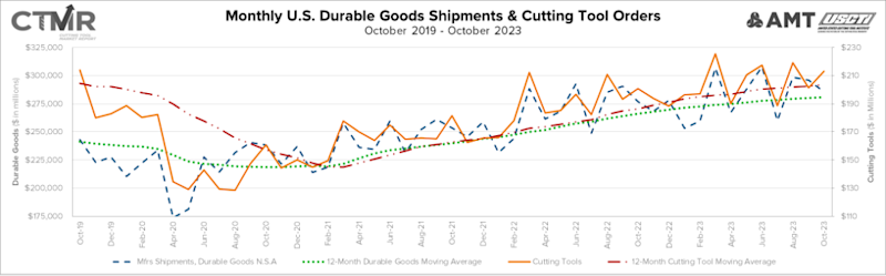 Eli Lustgarten, president at ESL Consultants, expanded: “Current U.S. cutting tool consumption data remains relatively strong despite the ongoing softness of U.S. manufacturing. Cutting tools are one of the last manufacturing sectors to return to pre-COVID levels. Indications are that conditions will be uncertain for the remainder of 2023 and into 2024. The ISM reported that November manufacturing in the United States contracted for the 13th consecutive month as the U.S. economy slowed under the pressure of higher rates and a consumer slowdown. With the unknown impact of current global turmoil and manufacturing inventories at normal levels or higher, customer orders are being delayed, and companies are focusing on right-sizing inventories. Sustaining current production levels near-term will be difficult. We expect cutting tool orders to remain firm, with 2023 orders of about $2.4 billion to $2.45 billion, likely about 6% to 7% above last year’s level. The first half of 2024 will likely be challenging; a soft economic landing with lower rates will help stabilize and enhance growth next year. The wild card is international turmoil.”