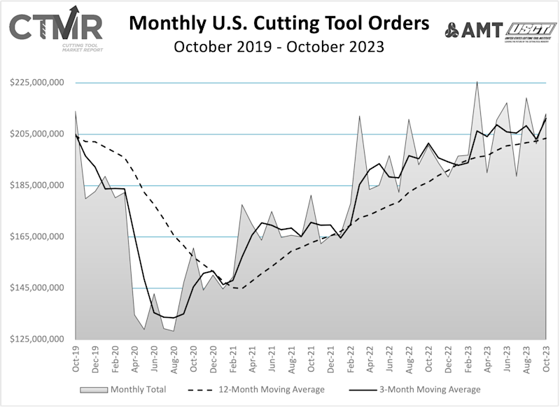 McLean, Va. (December 13, 2023) — October 2023 U.S. cutting tool consumption totaled $213 million, according to the U.S. Cutting Tool Institute (USCTI) and AMT – The Association For Manufacturing Technology. This total, as reported by companies participating in the Cutting Tool Market Report collaboration, was up 5.8% from September’s $201.4 million and up 6.1% when compared with the $200.6 million reported for October 2022. With a year-to-date total of $2.06 billion, 2023 is up 7.9% when compared to the same time period in 2022.