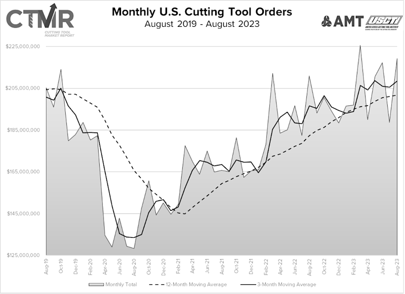 McLean, Va. (October 19, 2023) — August 2023 U.S. cutting tool consumption totaled $219.2 million, according to the U.S. Cutting Tool Institute (USCTI) and AMT – The Association For Manufacturing Technology. This total, as reported by companies participating in the Cutting Tool Market Report collaboration, was up 16.2% from July’s $188.6 million and up 4% when compared with the $210.9 million reported for August 2022. With a year-to-date total of $1.65 billion, 2023 is up 8.6% when compared to the same time period in 2022.