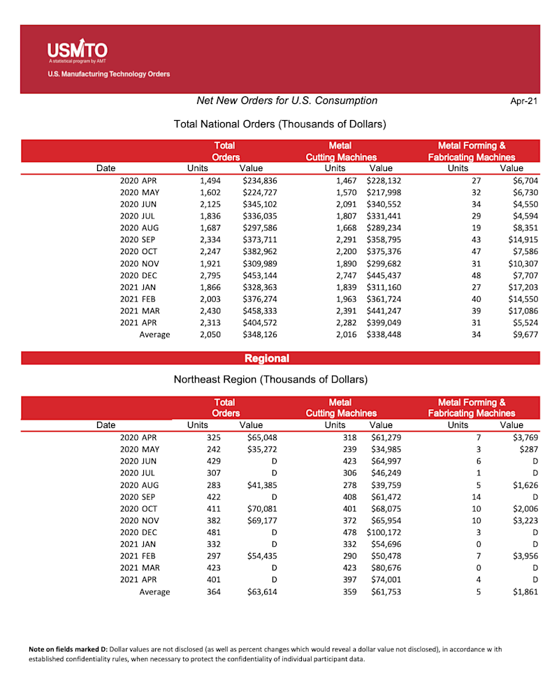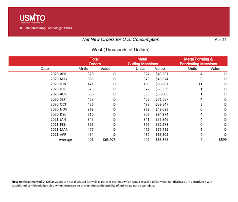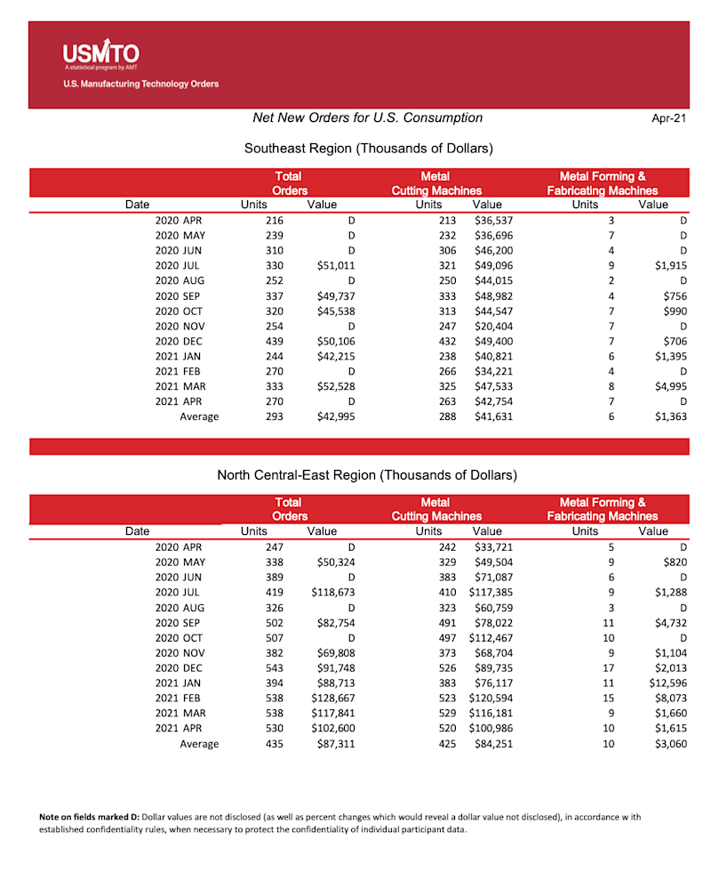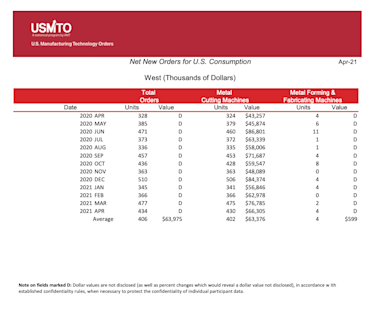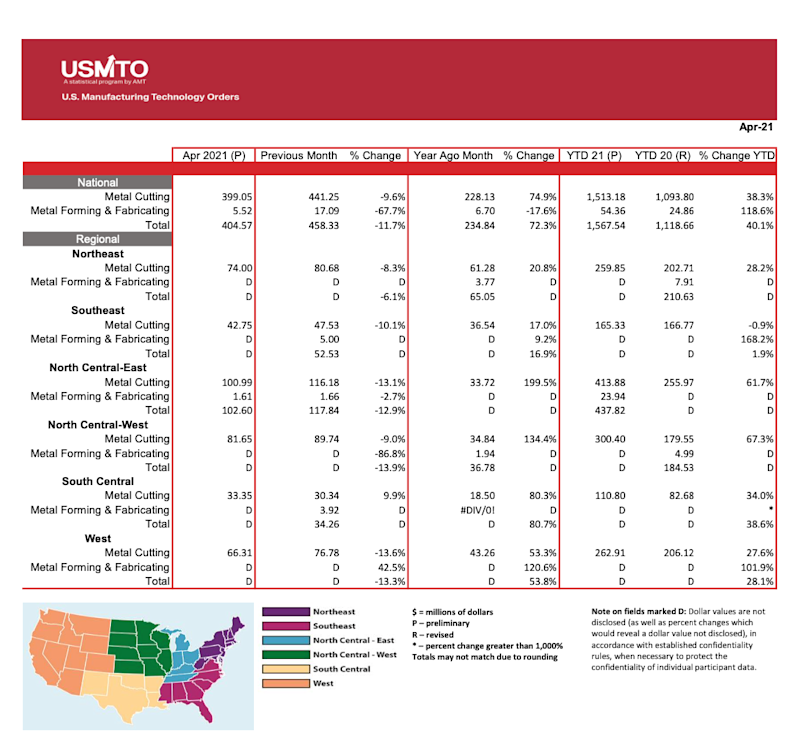 The United States Manufacturing Technology Orders (USMTO) Report is based on the totals of actual data reported by companies participating in the USMTO program. This report, compiled by AMT – The Association For Manufacturing Technology, provides regional and national U.S. orders data of domestic and imported machine tools and related equipment. Analysis of manufacturing technology orders provides a reliable leading economic indicator as manufacturing industries invest in capital metalworking equipment to increase capacity and improve productivity.