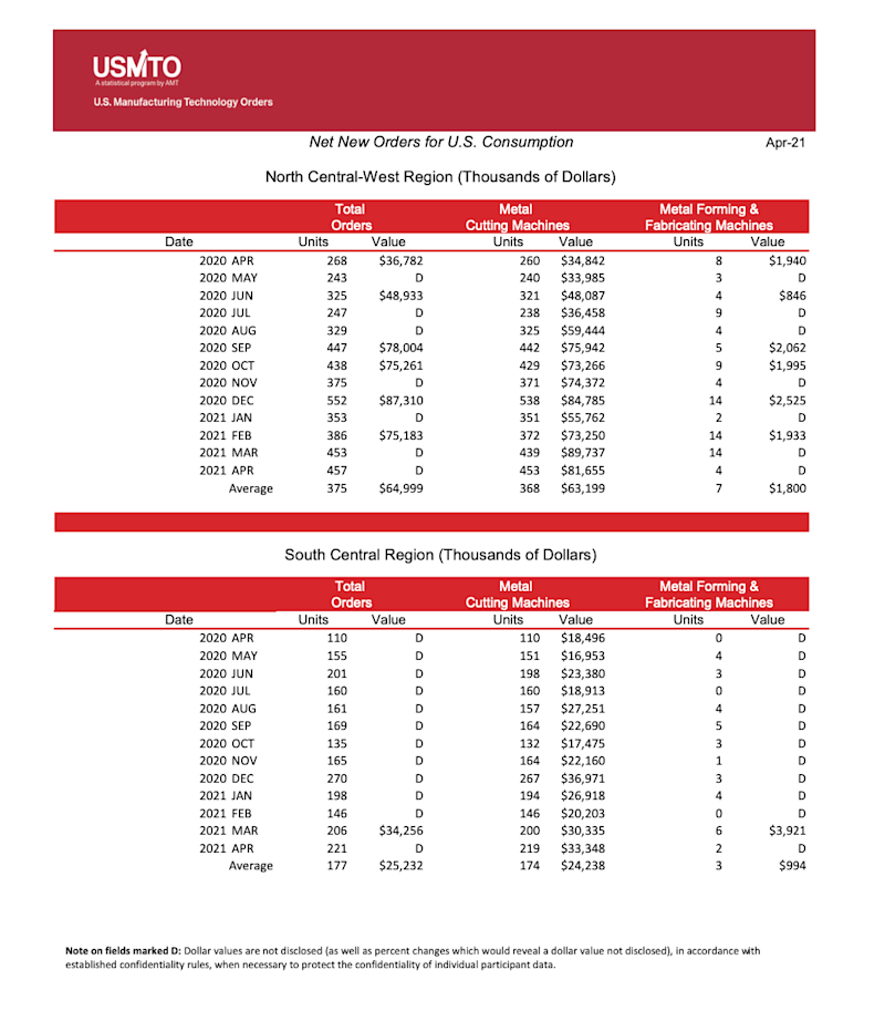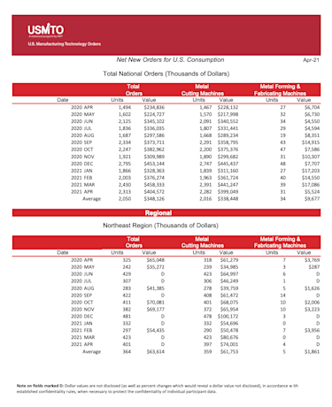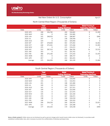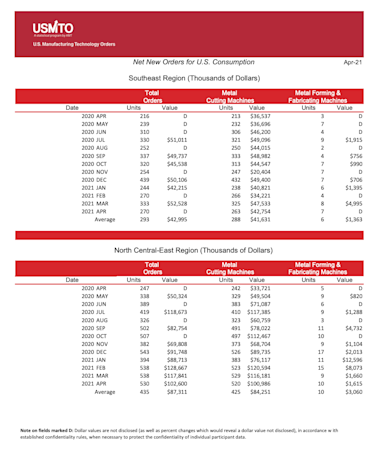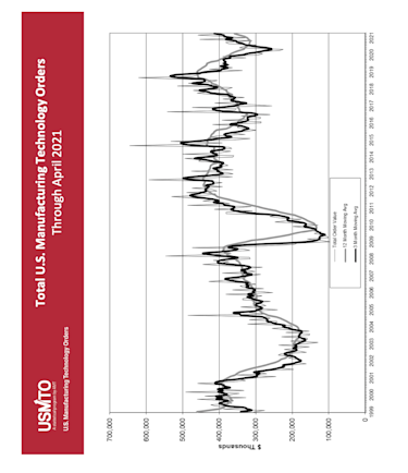 “There has been strong demand for metal cutting technologies in 2021, and orders for new forming technologies have more than doubled where they were at this point in 2020. Cosmetic automobile design changes drove increases in forming technologies and helped spur demand for cutting technologies from the mold and die industry. April orders were further strengthened by energy exploration and mining expanding out of Texas into nearby regions in response to increased market prices. Industries related to consumer products also increased orders in April, such as off-road vehicle manufacturing, electrical equipment manufacturing, and commercial and service industry machinery.