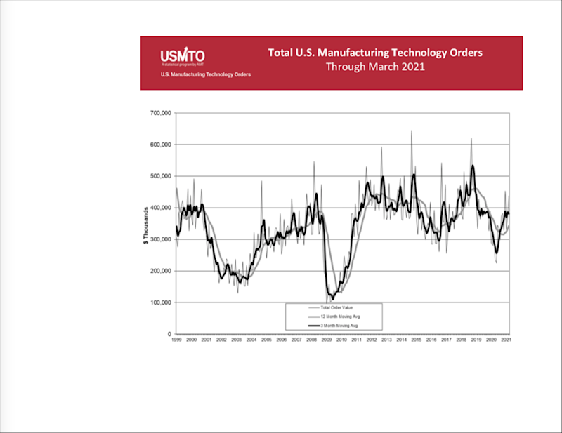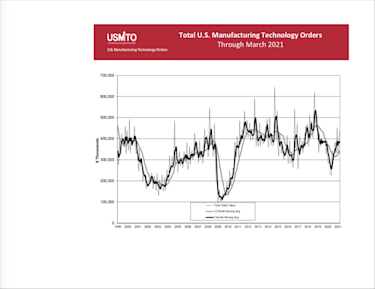 McLean, Va. (May 10, 2021) – U.S. Manufacturing Technology Orders totaled $437.9 million, an increase of 16.1% over February 2021 and an increase of 41.6% over March 2020, according to the latest U.S. Manufacturing Technology Orders report published by AMT – The Association For Manufacturing Technology. Total orders for 2021 reached $1.1 billion, almost one-third above the total orders in the first quarter of 2020.