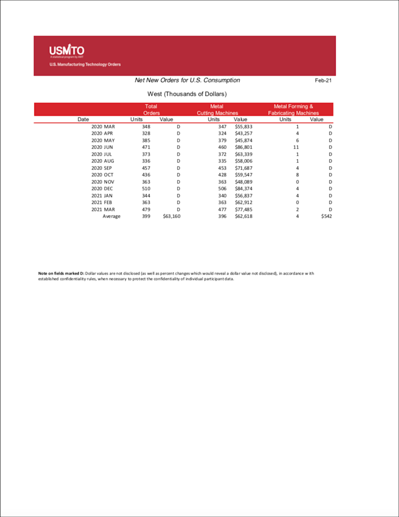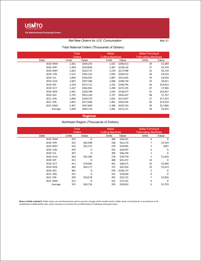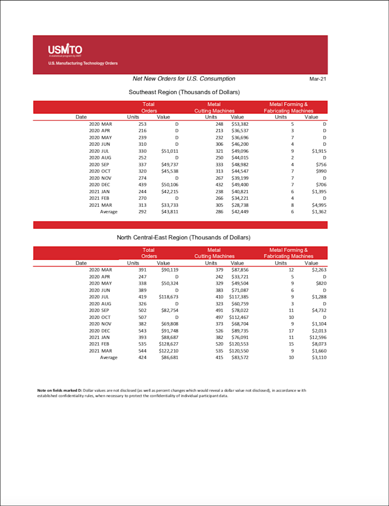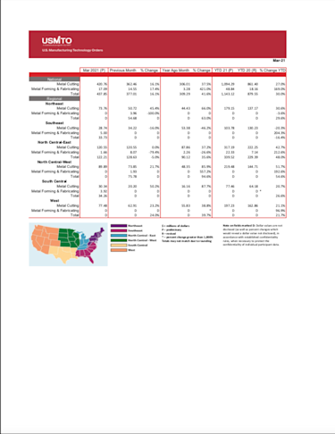 The United States Manufacturing Technology Orders (USMTO) Report is based on the totals of actual data reported by companies participating in the USMTO program. This report, compiled by AMT – The Association For Manufacturing Technology, provides regional and national U.S. orders data of domestic and imported machine tools and related equipment. Analysis of manufacturing technology orders provides a reliable leading economic indicator as manufacturing industries invest in capital metalworking equipment to increase capacity and improve productivity.