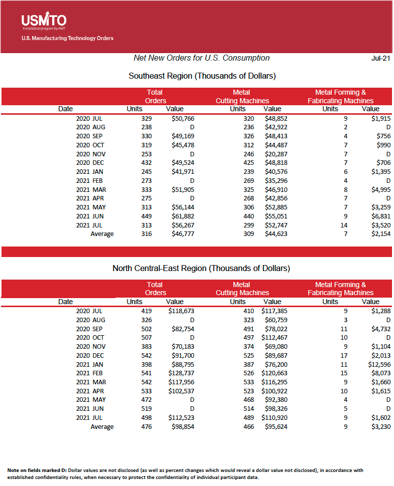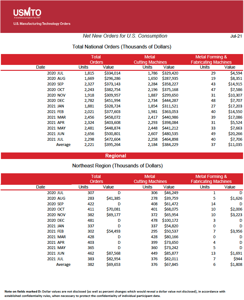 The United States Manufacturing Technology Orders (USMTO) Report is based on the totals of actual data reported by companies participating in the USMTO program. This report, compiled by AMT – The Association For Manufacturing Technology, provides regional and national U.S. orders data of domestic and imported machine tools and related equipment. Analysis of manufacturing technology orders provides a reliable leading economic indicator as manufacturing industries invest in capital metalworking equipment to increase capacity and improve productivity.