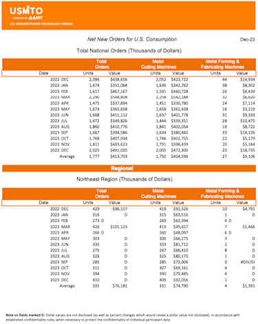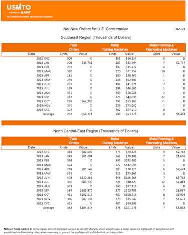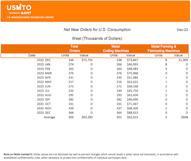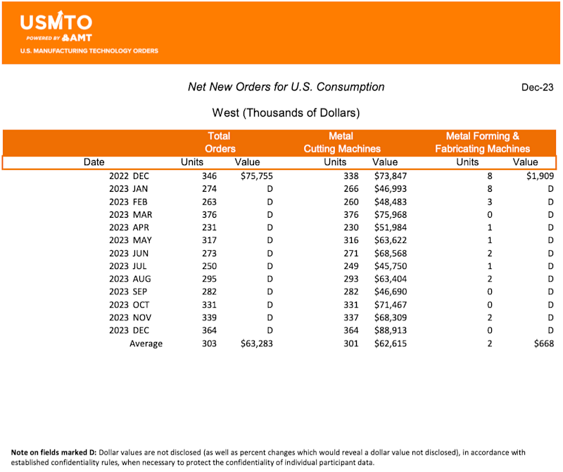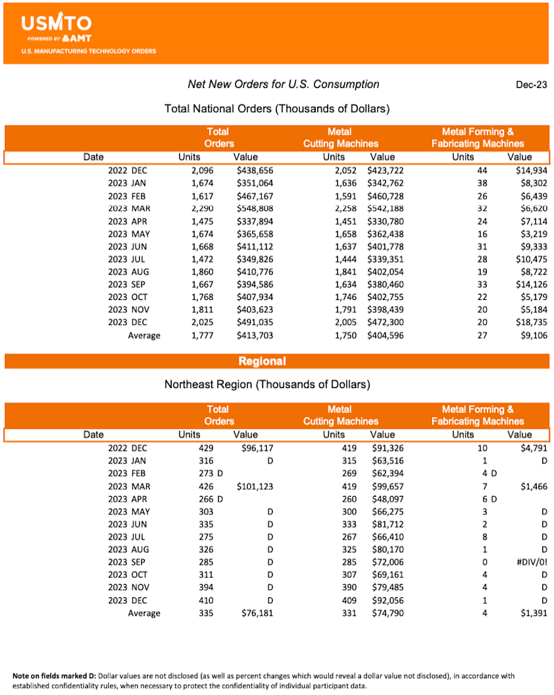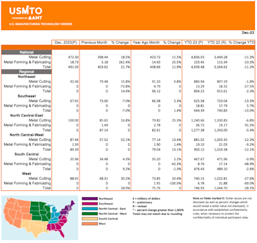 The United States Manufacturing Technology Orders (USMTO) Report is based on the totals of actual data reported by companies participating in the USMTO program. This report, compiled by AMT – The Association For Manufacturing Technology, provides regional and national U.S. orders data of domestic and imported machine tools and related equipment. Analysis of manufacturing technology orders provides a reliable leading economic indicator as manufacturing industries invest in capital metalworking equipment to increase capacity and improve productivity. USMTO.com.