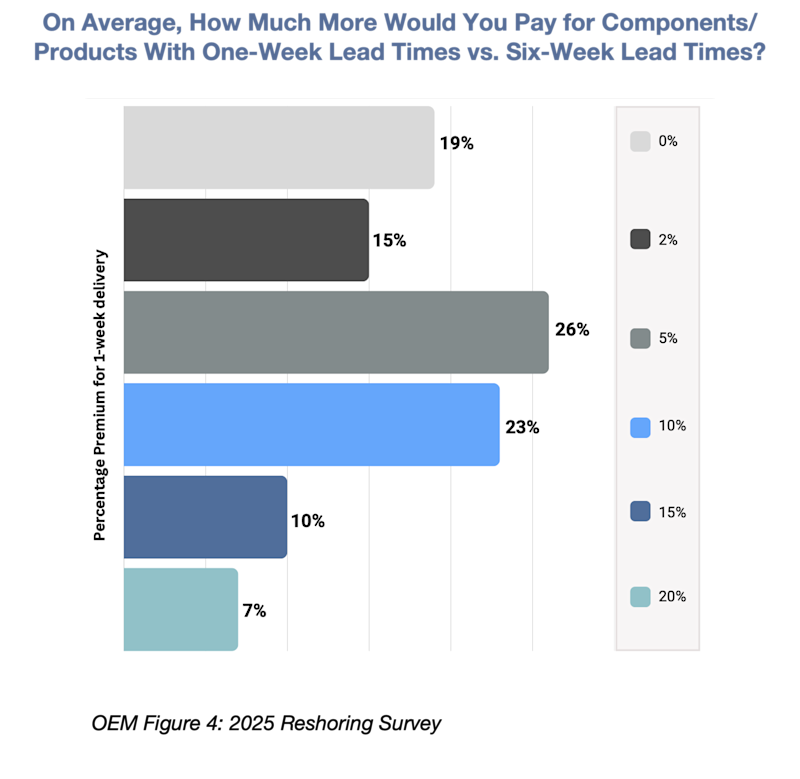 Forty percent of OEMs were willing to pay 10%-20% more for delivery that was five weeks faster. This premium for shorter lead times points to a great opportunity for CMs. Typical delivery time by surface freight from inland China/Asia to the Midwest is about six weeks. Nevertheless, some respondents lost business to imports based on delivery. Presumably, the benefit comes from much smaller inventories and better availability.