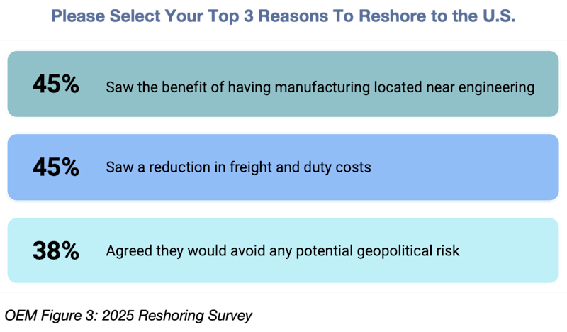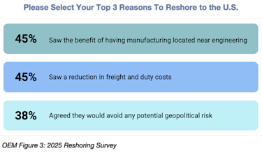 The top three reasons given for reshoring were locating manufacturing near engineering (45%), reducing freight and duty costs (45%), and avoiding geopolitical risk (38%). Proximity to customer markets was the next most cited reason for reshoring (35%).