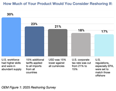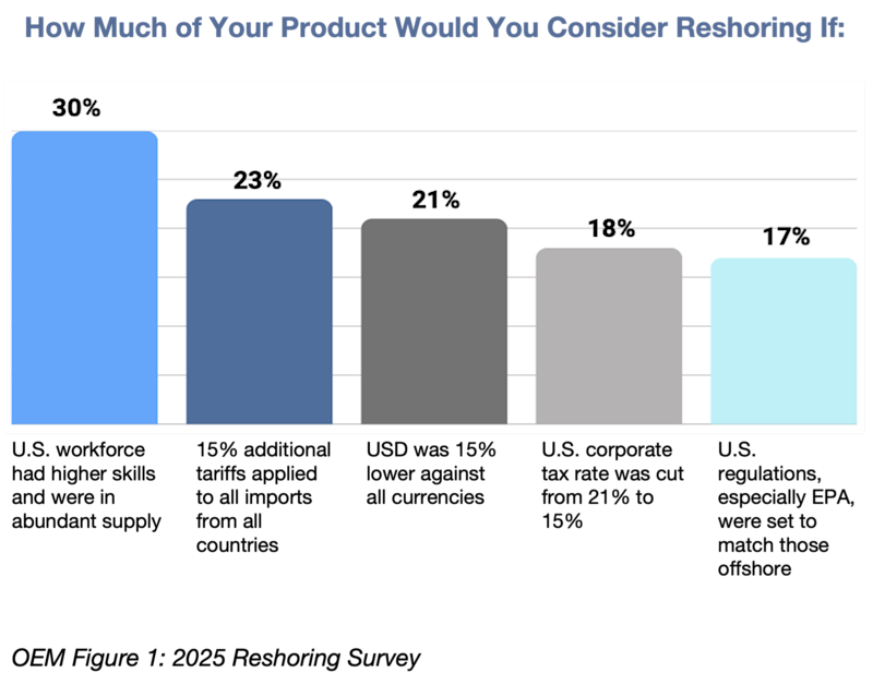 The primary driver for increasing reshoring is a larger, stronger, and more skilled U.S. workforce. Given that resource, OEMs would reshore 30% of their products currently offshored. If a 15% tariff were applied to all imports from all countries, OEMs would reshore 23% of what they currently produce offshore. This was followed by a 15% reduction in the value of the U.S. dollar (21%), corporate tax rate cuts from 21% to 15% (18%), and matching U.S. regulations with those offshore (17%).