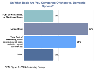 Only 30% of OEMs use the total cost of ownership (TCO) in comparing domestic to offshore sourcing. Seventeen percent continue to use Ex Works or plant-level costing, and 37% rely on landed cost. Seventeen percent use some other form of costing for their suppliers.