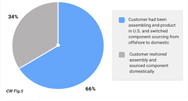 The typical scenario for CMs reshoring is an OEM customer with U.S. assembly operations shifting sourcing of components, parts, or tooling from offshore to a domestic supplier. This is reflected in Figure 5, showing that 66% of respondents’ reshoring was from customers assembling the end product in the United States and were moving component sourcing onshore. Thirty-four percent said their OEM customers reshored both assembly and sourcing.