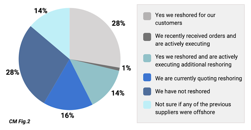 The survey determined that 59% of CMs have either already reshored for their customers, are actively reshoring, or are currently quoting reshoring. This article will focus on the CM responses.