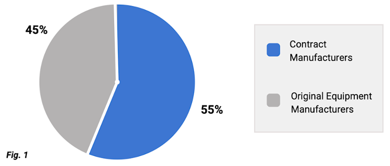 A contract manufacturer is defined as manufacturing parts, components, or tooling to be used in an OEM end product. Fifty five percent of relevant respondents were CMs, compared to 45% OEMs. (See Figure 1.)