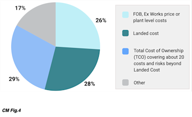 CMs said that the bases most of their customers are using to compare offshore versus domestic options are nearly evenly split between FOB/Ex Works/Plant Level Manufacturing Cost at 26%, Landed Cost at 28%, and Total Cost of Ownership at 29%. (See Figure 4.)