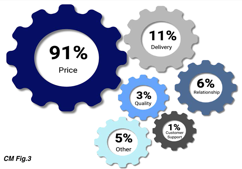 Ninety-one percent of respondents indicated that a primary reason they lost orders to imports was price. This aligns with the findings from OEMs, where 69% cited cost as their main factor for offshoring. (See Figure 3.)