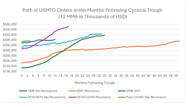 After the shallow downturn of the last two years, order activity – measured both in value and units – seems to have found a bottom. Comparing the last few months (light green) to recent examples of industry downturns, even when the general economy did not tip into recession, we can see that this is the highest level of order activity that we can characterize as a downturn. The closest example is the short recovery – and the last soft landing the economy experienced – following the downturn in 1999 (dark blue).