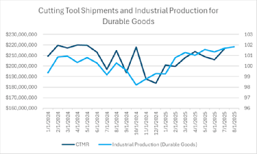 Industrial production of durable goods hit a low point in October 2024. Two months later, in December, shipments of cutting tools, measured by the Cutting Tool Market Report, hit their lowest point since 2022. Since then, industrial production and cutting tool consumption have reversed and are on an upward trend.