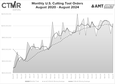 McLean, Va. (October 16, 2024) — Shipments of cutting tools, measured by the Cutting Tool Market Report compiled in a collaboration between AMT – The Association For Manufacturing Technology and the U.S. Cutting Tool Institute (USCTI), totaled $209.3 million in August 2024. Orders increased 9.1% from July 2024 but were down 4.5% from August 2023. Year-to-date shipments totaled $1.67 billion, up 1.5% from shipments made in the first eight months of 2023. The year-to-date growth rate has declined every month since April 2024.