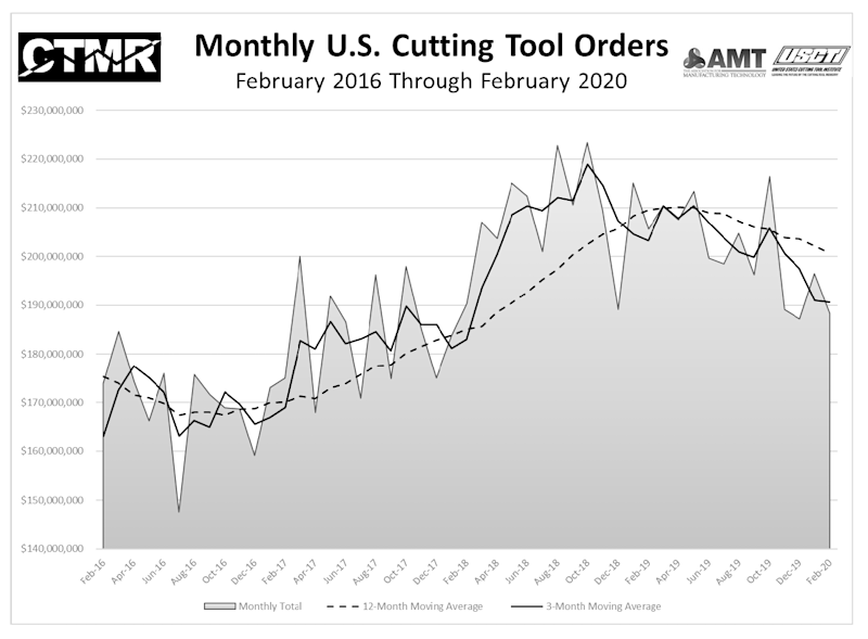 McLean, Va., (April 15, 2020) - February 2020 U.S. cutting tool consumption totaled $188.2 million, according to the U.S. Cutting Tool Institute (USCTI) and AMT – The Association For Manufacturing Technology. This total, as reported by companies participating in the Cutting Tool Market Report collaboration, was down 4.2 percent from January's $196.5 million and down 8.5 percent when compared with the $205.6 million reported for February 2019. With a year-to-date total of $384.7 million, 2020 is down 8.5 percent when compared with 2019.