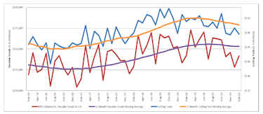 The graph below includes the 12-month moving average for the durable goods shipments and cutting tool orders. These values are calculated by taking the average of the most recent 12 months and plotting them over time.