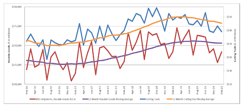 “Following a year of consolidation in 2019, cutting tool shipments are set to face a challenging 2020. The 8.5% year-over-year decline in cutting tool shipments in February is slightly worse than the 2.4% year-over-year drop in total durable goods shipments. With the economy facing a coronavirus-induced recession, the outlook through the summer will be challenging. A stronger dollar, reduced international demand and higher corporate spreads will likely add to the sectoral headwinds. However, a gradual relaxation of lockdown measures in the latter part of 2020, along with unprecedented fiscal and monetary policy stimulus should help progressively support activity in 2021,” said Greg Daco, Chief U.S. Economist for Oxford Economics USA.