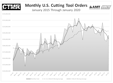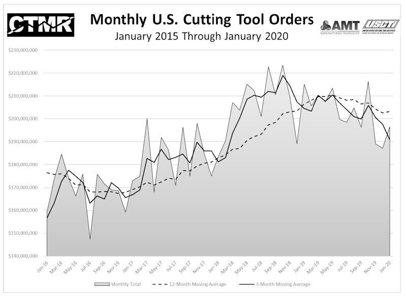 January 2020 U.S. cutting tool consumption totaled $196.5 million, according to the U.S. Cutting Tool Institute (USCTI) and AMT – The Association For Manufacturing Technology. This total, as reported by companies participating in the Cutting Tool Market Report collaboration, was up 5 percent from December's $187.2 million and down 8.6 percent when compared with the $215.1 million reported for January 2019. These numbers and all data in this report are based on the totals reported by the companies participating in the CTMR program. The totals here represent the majority of the U.S. market for cutting tools. According to Brad Lawton, Chairman of AMT’s Cutting Tool Product Group, “What is uncertainty? For the cutting tool industry, it could be slowly declining sales volumes for at least the last half of 2019, all international markets declining with the U.S. being the last to follow the pattern, stock market volatility, an election year and COVID-19! Did I miss anything? Now that is uncertainty, welcome to the new decade!” “Starting the 2020 calendar year behind January 2019 is not a surprise based on last year’s strong start and the economic headwinds facing the market today. The metalworking industry is feeling the negative effects of a flat automotive market and an aerospace market that has virtually halted the entire supply chain of the 737MAX. IHS forecasts have warned of a drop in consumption in the first quarter and this has unfortunately come to fruition,” said Tom Haag, President of SGS Kyocera. The Cutting Tool Market Report is jointly compiled by AMT and USCTI, two trade associations representing the development, production, and distribution of cutting tool technology and products. It provides a monthly statement on U.S. manufacturers’ consumption of the primary consumable in the manufacturing process – the cutting tool. Analysis of cutting tool consumption is a leading indicator of both upturns and downturns in U.S. manufacturing activity, as it is a true measure of actual production levels.