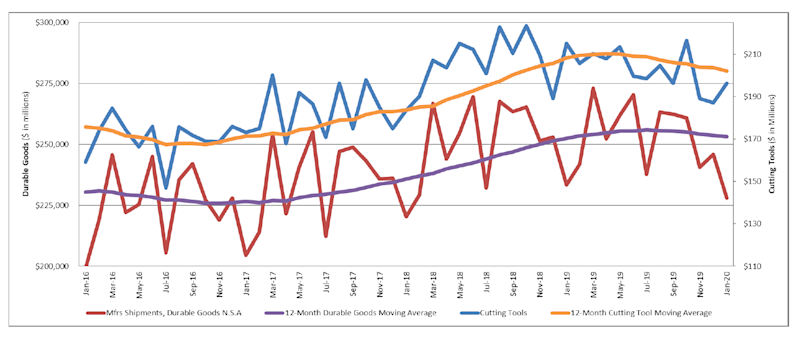 The graph below includes the 12-month moving average for the durable goods shipments and cutting tool orders. These values are calculated by taking the average of the most recent 12 months and plotting them over time.