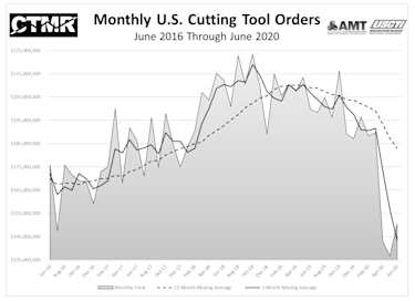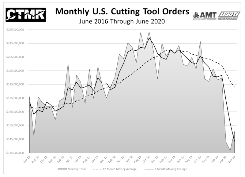 McLean, Va., (August, 12, 2020) - June 2020 U.S. cutting tool consumption totaled $150.6 million, according to the U.S. Cutting Tool Institute (USCTI) and AMT – The Association For Manufacturing Technology. This total, as reported by companies participating in the Cutting Tool Market Report collaboration, was up 10.1 percent from May's $136.8 million and down 24.6 percent when compared with the $199.7 million reported for June 2019. With a year-to-date total of $1 billion, 2020 is down 19.7 percent when compared with June 2019. These numbers and all data in this report are based on the totals reported by the companies participating in the CTMR program. The totals here represent the majority of the U.S. market for cutting tools.