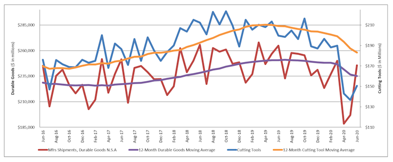 The Cutting Tool Market Report is jointly compiled by AMT and USCTI, two trade associations representing the development, production, and distribution of cutting tool technology and products. It provides a monthly statement on U.S. manufacturers’ consumption of the primary consumable in the manufacturing process – the cutting tool. Analysis of cutting tool consumption is a leading indicator of both upturns and downturns in U.S. manufacturing activity, as it is a true measure of actual production levels. Historical data for the Cutting Tool Market Report is available dating back to January 2012. This collaboration of AMT and USCTI is the first step in the two associations working together to promote and support U.S.-based manufacturers of cutting tool technology. The graph below includes the 12-month moving average for the durable goods shipments and cutting tool orders. These values are calculated by taking the average of the most recent 12 months and plotting them over time.