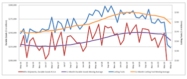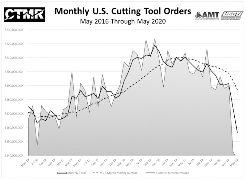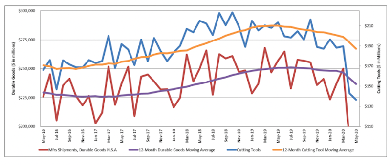 May 2020 U.S. cutting tool consumption totaled $136.6 million, according to the U.S. Cutting Tool Institute (USCTI) and AMT – The Association For Manufacturing Technology. This total, as reported by companies participating in the Cutting Tool Market Report collaboration, was down 4.4 percent from April's $142.9 million and down 36 percent when compared with the $213.4 million reported for May 2019. With a year-to-date total of $854.1 million, 2020 is down 18.8 percent when compared with May 2019. These numbers and all data in this report are based on the totals reported by the companies participating in the CTMR program. The totals here represent the majority of the U.S. market for cutting tools. According to Brad Lawton, Chairman of AMT’s Cutting Tool Product Group, “The cutting tool industry is doing its best to survive the effects of the forced pandemic recession, that is resulting in a significant decline in shipments.” Lawton added, “The questions are, when will we see recovery, in the third quarter or after the first week of November? And will we return to the sales volumes experienced in 2018 and 2019? Whatever the answers, the facts are that the financial effects will be with the industry for an extended period.” “The cutting tool market in May continued to shrink from April but at a much slower pace. We are now starting to see some market segments begin to stabilize and those segments should start to recover slowly in the months ahead,” commented Phil Kurtz, Vice President of Business Development of Dormer Pramet. He then stated, “It is very possible April and May will represent the bottom of the cycle, but considering the volatility of the current market only time will tell.” The Cutting Tool Market Report is jointly compiled by AMT and USCTI, two trade associations representing the development, production, and distribution of cutting tool technology and products. It provides a monthly statement on U.S. manufacturers’ consumption of the primary consumable in the manufacturing process – the cutting tool. Analysis of cutting tool consumption is a leading indicator of both upturns and downturns in U.S. manufacturing activity, as it is a true measure of actual production levels. Historical data for the Cutting Tool Market Report is available dating back to January 2012. This collaboration of AMT and USCTI is the first step in the two associations working together to promote and support U.S.-based manufacturers of cutting tool technology. The graph below includes the 12-month moving average for the durable goods shipments and cutting tool orders. These values are calculated by taking the average of the most recent 12 months and plotting them over time.