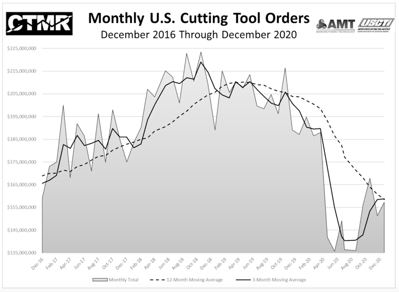 McLean, Va., (February 16, 2021) - December 2020 U.S. cutting tool consumption totaled $157.3 million, according to the U.S. Cutting Tool Institute (USCTI) and AMT – The Association For Manufacturing Technology. This total, as reported by companies participating in the Cutting Tool Market Report collaboration, was up 4% from November's $151.3 million and down 16% when compared with the $187.2 million reported for December 2019. With a year-to-date total of $1.9 billion, 2020 was down 22.2% when compared with December 2019.