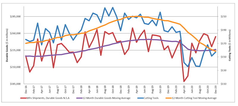 According to Bret Tayne, President of USCTI, “The most recent data from cutting tool manufacturers support and extend the modest recovery we experienced in the last four months of 2020, despite weaker reports for the month of November. The recovery is uneven, to be sure. Some sectors of the cutting tool user base may not recover for an extended period of time, but the overall market data is improving.”