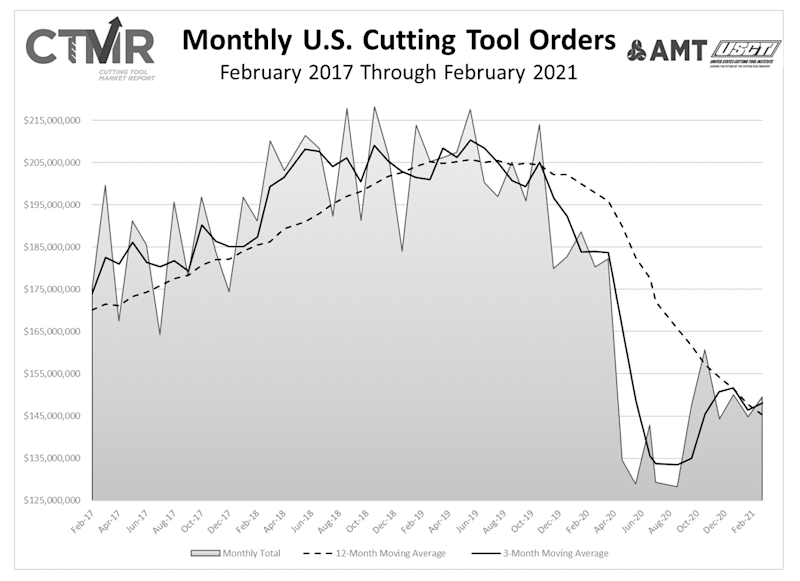 McLean, Va., (April 28, 2021) - February 2021 U.S. cutting tool consumption totaled $149.5 million, according to the U.S. Cutting Tool Institute (USCTI) and AMT – The Association for Manufacturing Technology. This total, as reported by companies participating in the Cutting Tool Market Report collaboration, was up 3.3% from January's $144.8 million and down 17.1% when compared with the $180.3 million reported for February 2020. With a year-to-date total of $294.3 million, 2021 is down 20.2% when compared to February 2020. Please note, AMT and USCTI have revised monthly press release totals back to 2015 in an effort to provide the best possible data possible to the community. Please reach out to Pat McGibbon with any questions.
