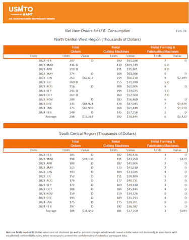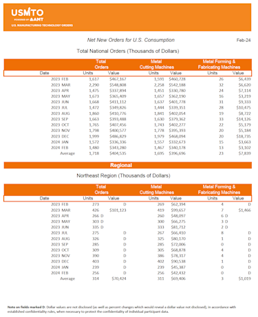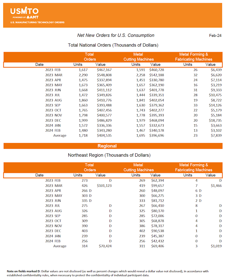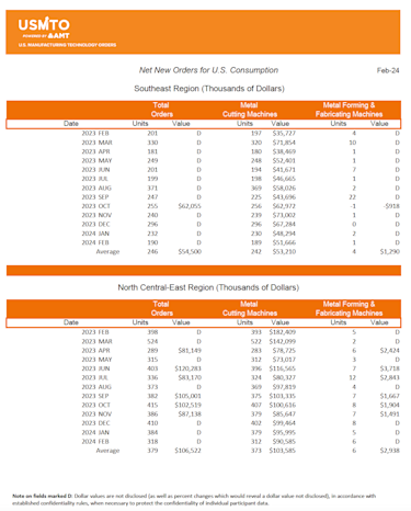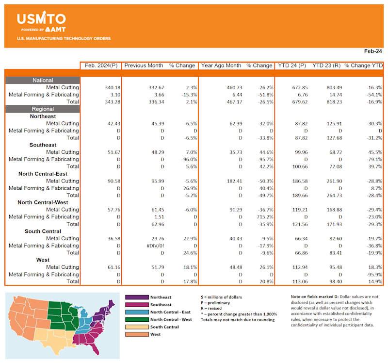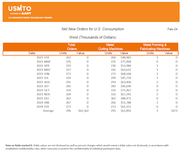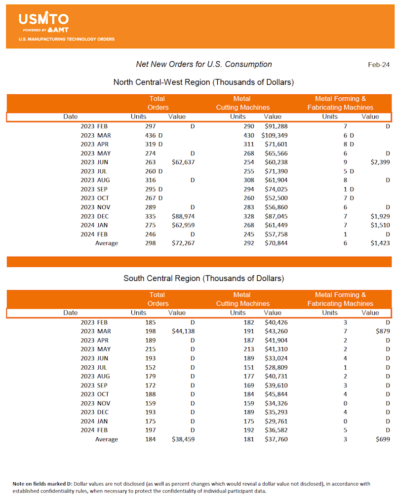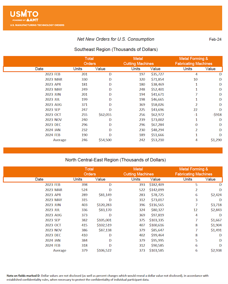 The United States Manufacturing Technology Orders (USMTO) Report is based on the totals of actual data reported by companies participating in the USMTO program. This report, compiled by AMT – The Association For Manufacturing Technology, provides regional and national U.S. orders data of domestic and imported machine tools and related equipment. Analysis of manufacturing technology orders provides a reliable leading economic indicator as manufacturing industries invest in capital metalworking equipment to increase capacity and improve productivity. USMTO.com.