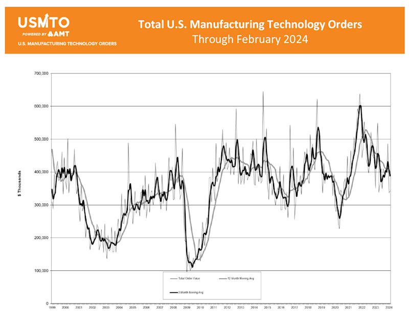 McLean, Va. (April 9, 2024) — Orders of manufacturing technology, measured by the U.S. Manufacturing Technology Orders Report published by AMT – The Association For Manufacturing Technology, totaled $343.3 million in February 2024. This was a 2.1% increase from January 2024 but a 26.5% decline from February 2023. Year-to-date orders reached $679.6 million, a decline of 16.9% from the first two months of 2023.