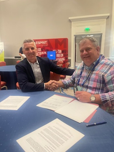 Doug Woods, president of AMT, and Rick Kline Jr., president of Gardner Business Media, sign the cooperation agreement for FITMA.