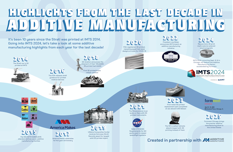 Looking back on the last decade to the 3D printed Strati car at IMTS 2014, additive manufacturing has continued to expand its reach with applications on Mars, in football helmets, aboard the U.S. Navy, and inside the jet engines that enable modern aviation today.