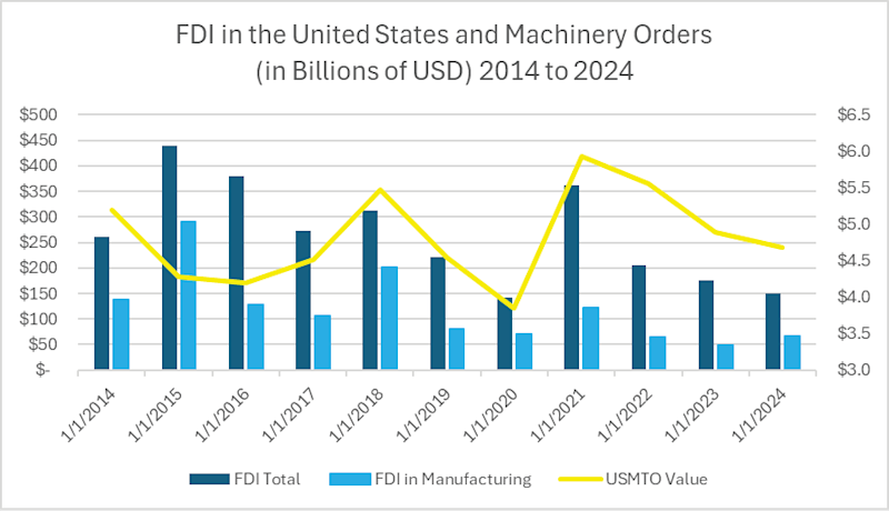 Additionally, an interesting pattern emerges from the data: The total amount of FDI going into the United States had a stronger correlation with new manufacturing technology orders than FDI in just the manufacturing sector. What’s more, greenfield investments in manufacturing – the types most likely to require additional machinery – has a weaker correlation with manufacturing technology orders than with total FDI. This analysis, while terse, could indicate that while FDI and machinery orders tend to be correlated, no causal link has been established between increased investments from foreign nationals and machine tool purchases. In generally good economic situations, expanding U.S.-based businesses and purchasing machinery to meet growing demand for discrete parts are both attractive investments.