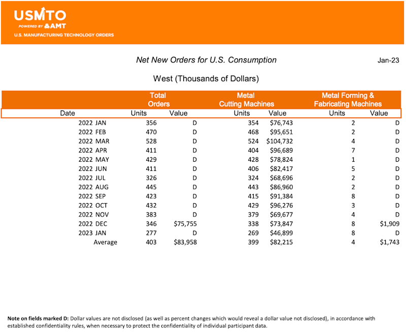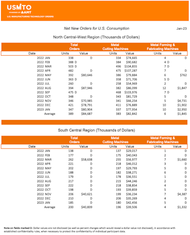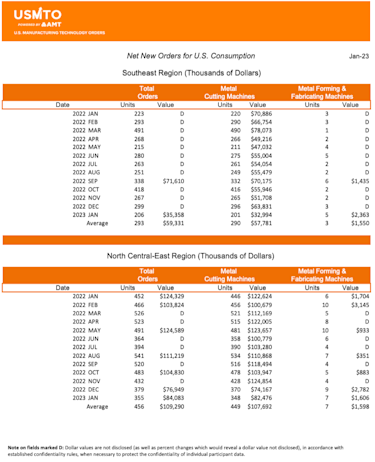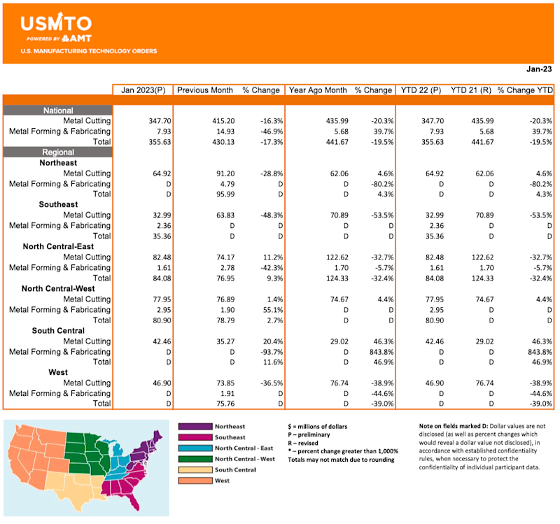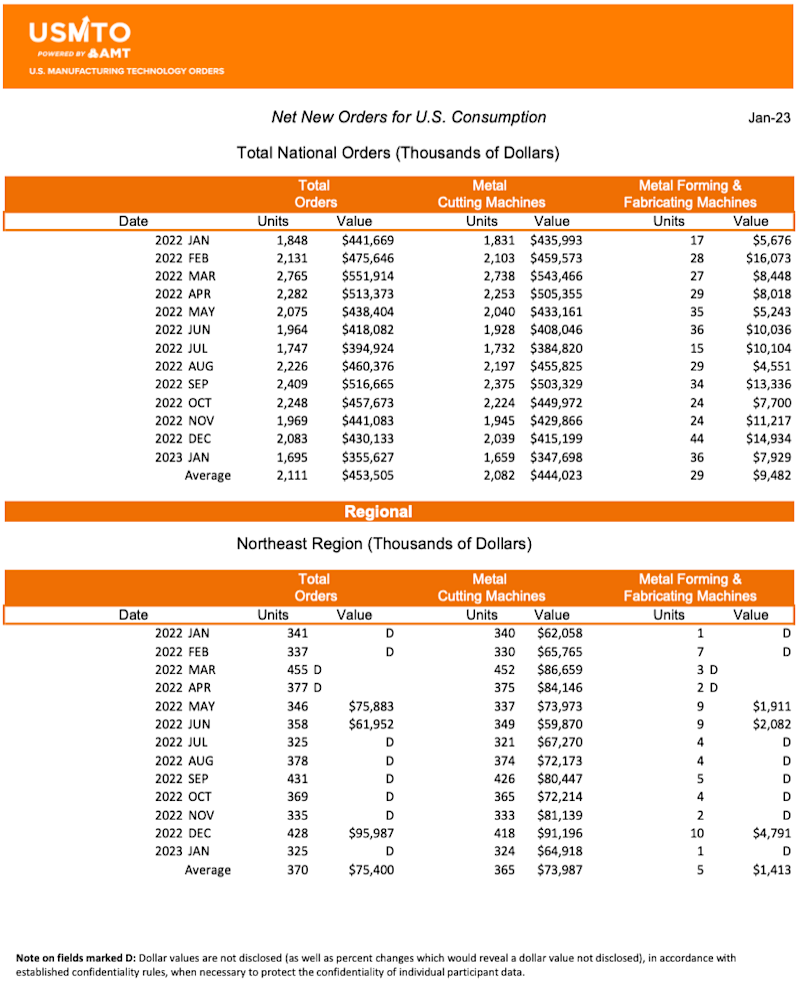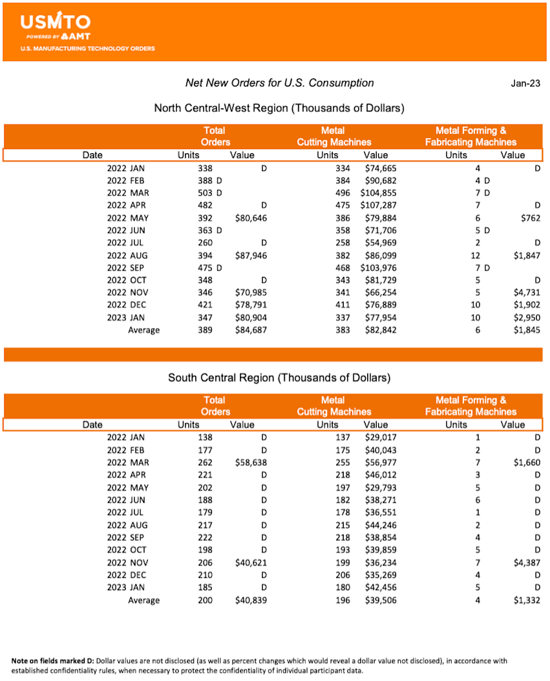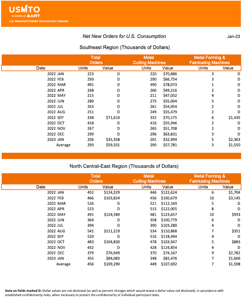 The United States Manufacturing Technology Orders (USMTO) Report is based on the totals of actual data reported by companies participating in the USMTO program. This report, compiled by AMT – The Association For Manufacturing Technology, provides regional and national U.S. orders data of domestic and imported machine tools and related equipment. Analysis of manufacturing technology orders provides a reliable leading economic indicator as manufacturing industries invest in capital metalworking equipment to increase capacity and improve productivity.