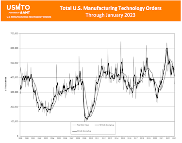 McLean, Va. (March 13, 2023) – New orders of manufacturing technology totaled $355.6 million in January 2023, according to the latest U.S. Manufacturing Technology Orders Report published by AMT – The Association For Manufacturing Technology. January 2023 orders were down 17% from December 2022 and down nearly 20% from January 2022.