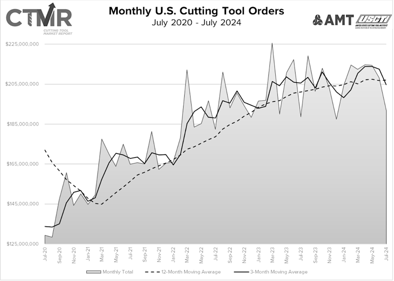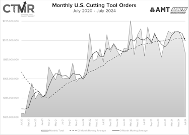 “July is typically a slower month, but overall, the curve has flattened out,” stated Jack Burley, chairman of AMT’s Cutting Tool Product Group. “Commercial aerospace and automotive production have leveled off, and this has a direct impact on cutting tool consumption and new orders. As we near the end of the third quarter, I expect shipments of cutting tools to continue to trend as they have so far this year, and we all remain optimistic that IMTS will provide the necessary boost to our shipments for a positive end to 2024.”