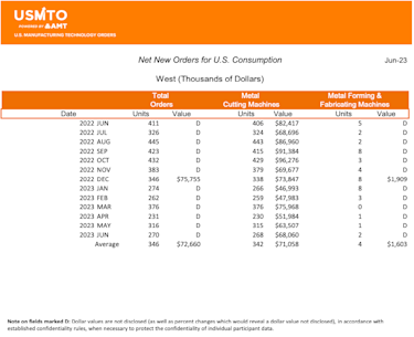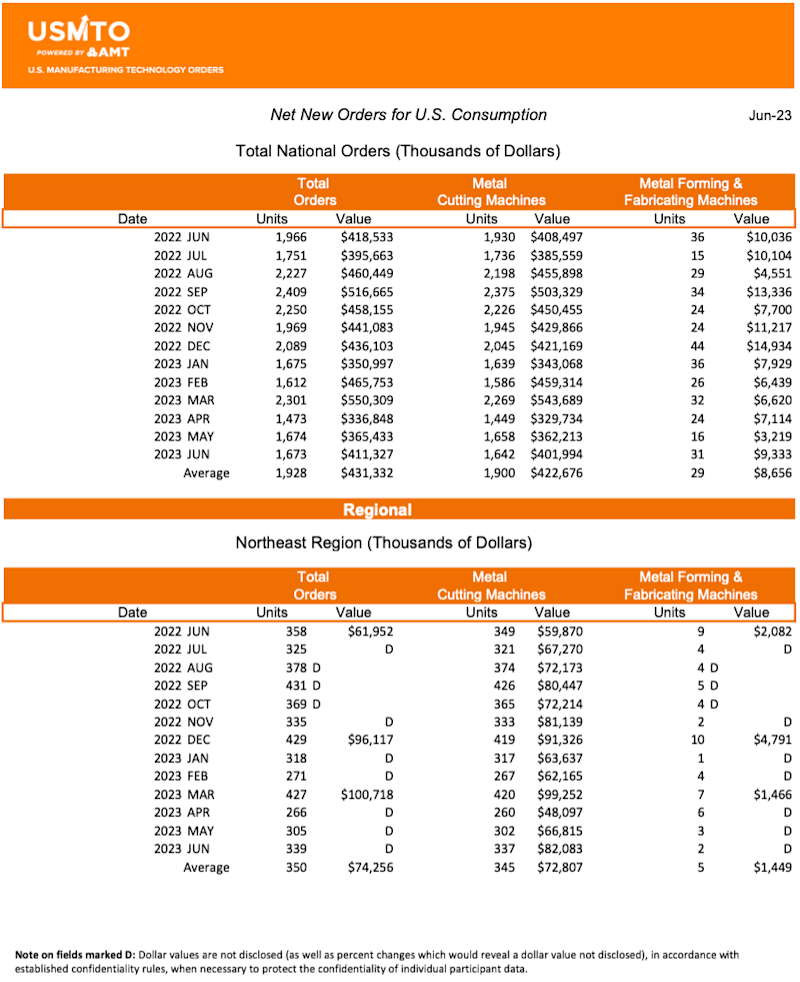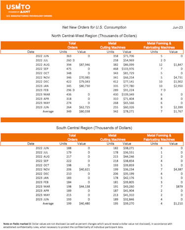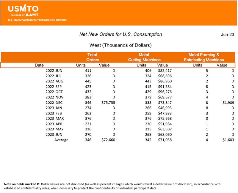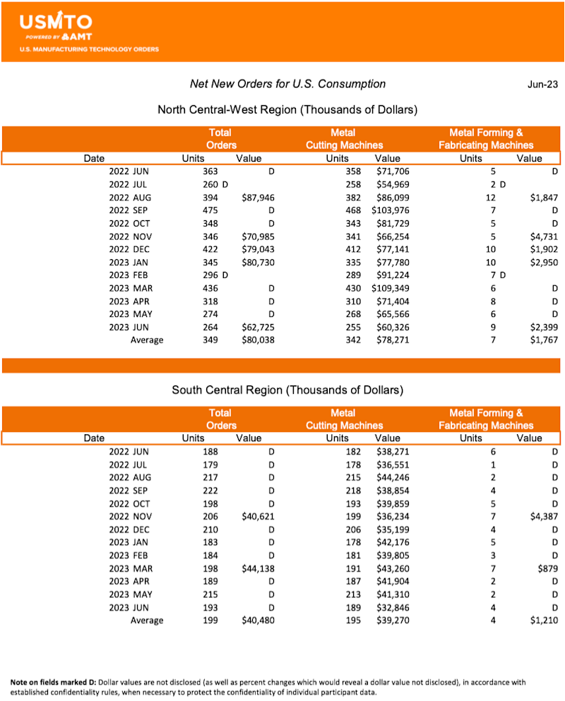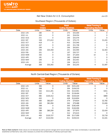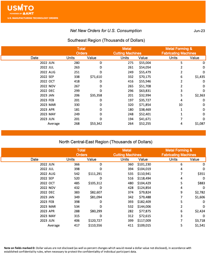The United States Manufacturing Technology Orders (USMTO) Report is based on the totals of actual data reported by companies participating in the USMTO program. This report, compiled by AMT – The Association For Manufacturing Technology, provides regional and national U.S. orders data of domestic and imported machine tools and related equipment. Analysis of manufacturing technology orders provides a reliable leading economic indicator as manufacturing industries invest in capital metalworking equipment to increase capacity and improve productivity.