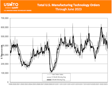 McLean, Va. (August 14, 2023) — New orders of manufacturing technology totaled $411.3 million in June 2023, according to the latest U.S. Manufacturing Technology Orders Report published by AMT – The Association For Manufacturing Technology. June 2023 orders increased 12.6% over May 2023 but fell 1.7% below orders in June 2022. This brings total orders through the first half of 2023 to nearly $2.5 billion, about 13% below the total for the first half of 2022.
