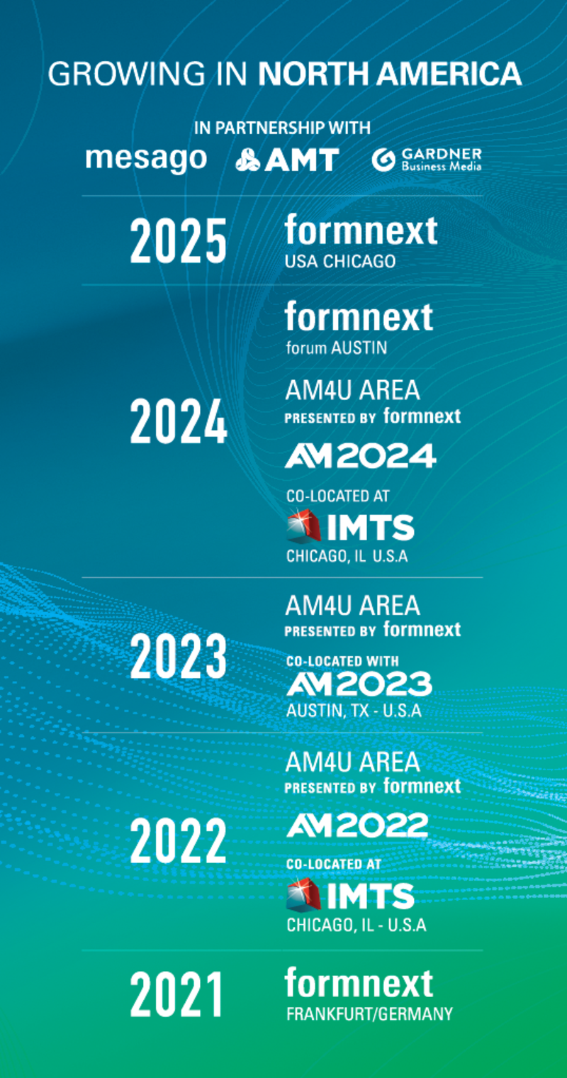 2024: Formnext Forum Austin will launch as a standalone confex (conference with exhibition) in partnership with Gardner Business Media and AMT; co-located at IMTS 2024 will be AM4U Area presented by Formnext and the Additive Manufacturing Conference 2024.