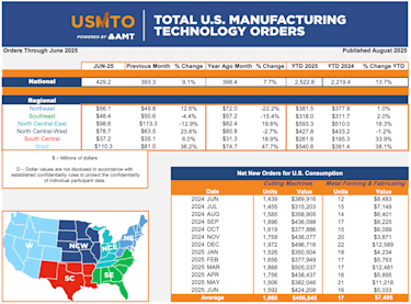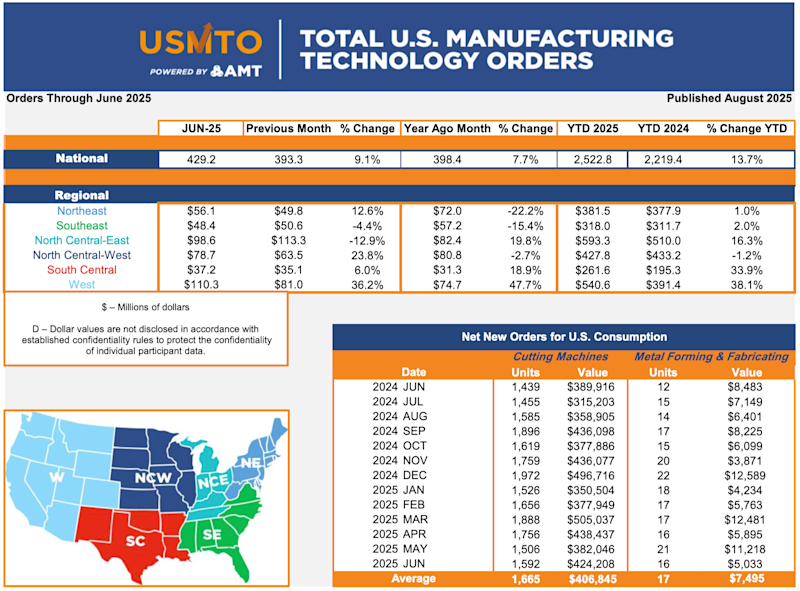 McLean, Va. (August 11, 2025) — New orders of metalworking machinery, measured by the U.S. Manufacturing Technology Orders Report published by AMT – The Association For Manufacturing Technology, totaled $429.2 million in June 2025. This was a 9.1% increase from May 2025 and a 7.7% increase from June 2024. Machinery orders placed through June 2025 totaled $2.52 billion, a 13.7% increase over the first half of 2024.
