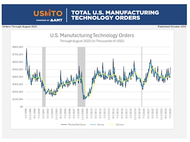 McLean, Va. (October 13, 2025) — New orders of metalworking machinery, measured by the U.S. Manufacturing Technology Orders Report published by AMT – The Association For Manufacturing Technology, totaled $529.4 million in August 2025. This was a 36.2% increase from July 2025 and nearly a 45% increase from August 2024. Machinery orders placed through August 2025 totaled $3.44 billion, an 18.3% increase over the first eight months of 2024.