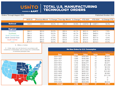 The United States Manufacturing Technology Orders (USMTO) Report is based on the totals of actual data reported by companies participating in the USMTO program. This report, compiled by AMT – The Association For Manufacturing Technology, provides regional and national U.S. orders data of domestic and imported machine tools and related equipment. Analysis of manufacturing technology orders provides a reliable leading economic indicator as manufacturing industries invest in capital metalworking equipment to increase capacity and improve productivity. USMTO.com.