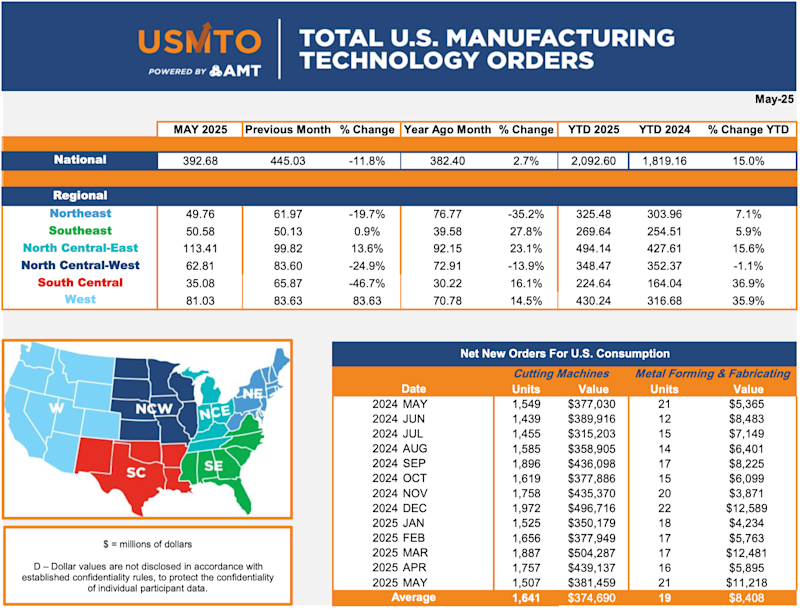 McLean, Va. (July 14, 2025) — New orders of metalworking machinery, measured by the U.S. Manufacturing Technology Orders Report published by AMT – The Association For Manufacturing Technology, totaled $392.7 million in May 2025. This was an 11.8% decline from April 2025 and a 2.7% increase from May 2024. Machinery orders in 2025 placed through May totaled $2.09 billion, a 15% increase over the first five months of 2024.